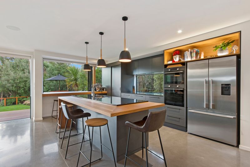 A grand design with interior to match, premium materials have been chosen and stylish modern opulence is evident. The kitchen features high end Asko/Bosch appliances, a double oven, granite stone - solid oak benchtops, quality tapware, mood lighting and walk in pantry. Socially configured with both open plan and formal living with capacity to entertain on a high scale. Four bedrooms total, master having WIR, luxury ensuite, laundry chute and deck access. All three bathrooms are tiled and glamourous. Heating is catered by a low emission log burner and heat pump. Oversized joinery allows sunlight to absorb in the concrete slab which retains heat. The home enjoys views of both the Southern Alps and Port Hills from inside.
